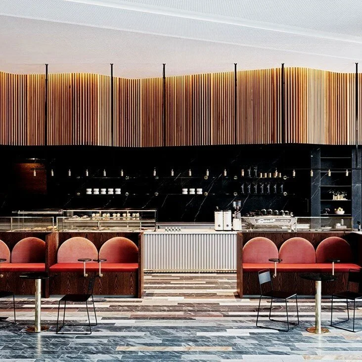 An intricate, impressive hand made wave of wooden layers is the stand out feature on the exterior of the Toby's Estate cafe nestled just off Castlereagh Street in the Westfield building.